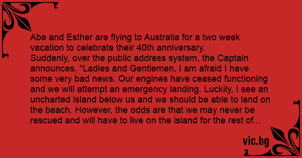 Abe and Esther are flying to Australia for a two week vacation to celebrate their 40th anniversary.