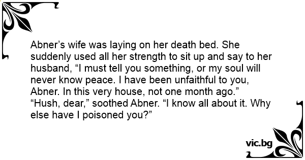 Abner’s wife was laying on her death bed. She suddenly used all her strength to sit up and say to her husband, “I must tell you something, or my soul will never know peace. I have been unfaithful to you, Abner. In this very house, not one month ago.”