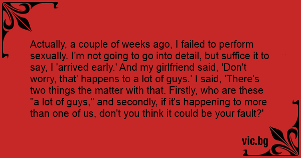 Actually, a couple of weeks ago, I failed to perform sexually. I'm not going to go into detail, but suffice it to say, I 'arrived early.' And my girlfriend said, 'Don't worry, that' happens to a lot of guys.' I said, 'There's two things the matter with that. Firstly, who are these "a lot of guys," and secondly, if it's happening to more than one of us, don't you think it could be your fault?'