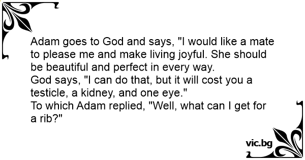 En dag när Adam gick i paradiset så frågade han Gud om inte denne kunde fixa fram en partner åt honom. "Jodå," sa Gud. "Men det kostar dig höger öra, vänster arm, tre fingrar på höger hand, höger...