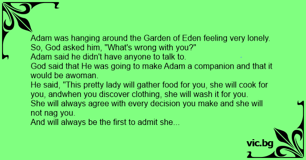 Da Gud havde skabt Adam, kunne han se, at han var ensom, så han besluttede sig for at hjælpe. Han sagde til Adam: "Jeg vil give dig en kvinde. Hun vil elske dig, lave mad til dig, være sød ved dig...