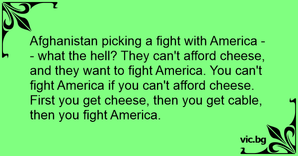 Afghanistan picking a fight with America -- what the hеll? They can't afford cheese, and they want to fight America. You can't fight America if you can't afford cheese. First you get cheese, then you get cable, then you fight America.