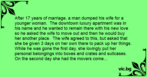 After 17 years of marriage, a man dumped his wife for a younger woman. The downtown luxury apartment was in his name and he wanted to remain there with his new love so he asked the wife to move out and then he would buy her another place. The wife agreed to this, but asked that she be given 3 days on her own there to pack up her things.