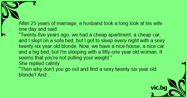 "Twenty-five years ago, we had a cheap apartment, a cheap car, and I slept on a sofa bed, but I got to sleep every night with a sеxy twenty-six year old blonde. Now, we have a nice house, a nice car and a big bed, but I'm sleeping with a fifty-one year old woman. It seems that you're not pulling your weight."