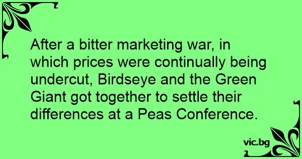After a bitter marketing war, in which prices were continually being undercut, Birdseye and the Green Giant got together to settle their differences at a Peas Conference.