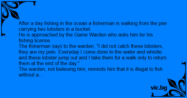 The fisherman says to the warden, "I did not catch these lobsters, they are my pets. Everyday I come done to the water and whistle and these lobster jump out and I take them for a walk only to return them at the end of the day."
