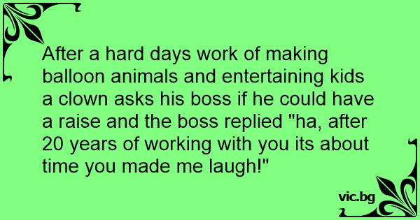 After a hard days work of making balloon animals and entertaining kids a clown asks his boss if he could have a raise and the boss replied "ha, after 20 years of working with you its about time you made me laugh!"
