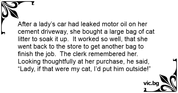 After a lady’s car had leaked motor oil on her cement driveway, she bought a large bag of cat litter to soak it up. It worked so well, that she went back to the store to get another bag to finish the job. The clerk remembered her. Looking thoughtfully at her purchase, he said, “Lady, if that were my cat, I’d put him outside!”