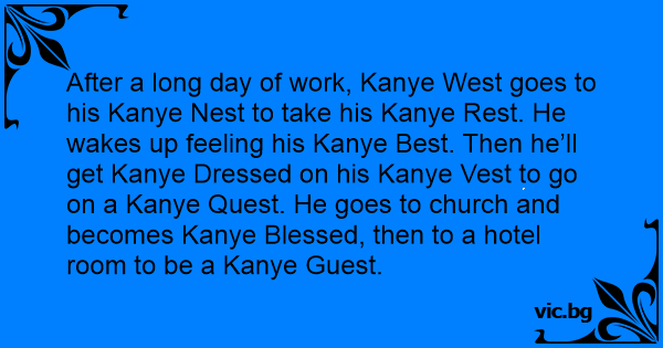 After a long day of work, Kanye West goes to his Kanye Nest to take his Kanye Rest. He wakes up feeling his Kanye Best. Then he’ll get Kanye Dressed on his Kanye Vest to go on a Kanye Quest. He goes to church and becomes Kanye Blessed, then to a hotel room to be a Kanye Guest.