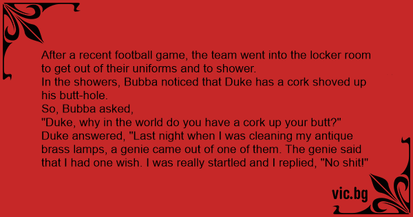 Duke answered, "Last night when I was cleaning my antique brass lamps, a genie came out of one of them. The genie said that I had one wish. I was really startled and I replied, "No shiт!"