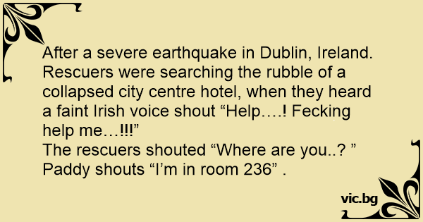 Rescuers were searching the rubble of a collapsed city centre hotel, when they heard a faint Irish voice shout “Help….! Fecking help me…!!!”