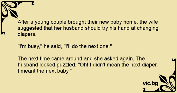 The next time came around and she asked again. The husband looked puzzled. "Oh! I didn't mean the next diaper. I meant the next baby."