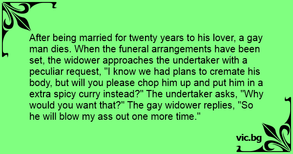 After being married for twenty years to his lover, a gаy man dies. When the funeral arrangements have been set, the widower approaches the undertaker with a peculiar request, "I know we had plans to cremate his body, but will you please chop him up and put him in a extra spicy curry instead?" The undertaker asks, "Why would you want that?" The gаy widower replies, "So he will вlоw my аss out one more time."