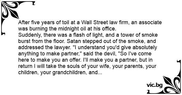 Suddenly, there was a flash of light, and a tower of smoke burst from the floor. Sатаn stepped out of the smoke, and addressed the lawyer. "I understand you'd give absolutely anything to make partner," said the devil, "So I've come here to make you an offer. I'll make you a partner, but in return I will take the souls of your wife, your parents, your children, your grandchildren, and all of your friends."