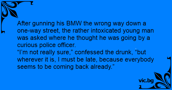 After gunning his BMW the wrong way down a one-way street, the rather intoxicated young man was asked where he thought he was going by a curious police officer.