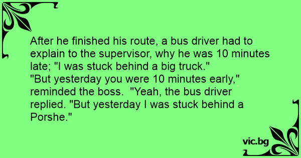 "But yesterday you were 10 minutes early," reminded the boss. "Yeah, the bus driver replied. "But yesterday I was stuck behind a Porshe."