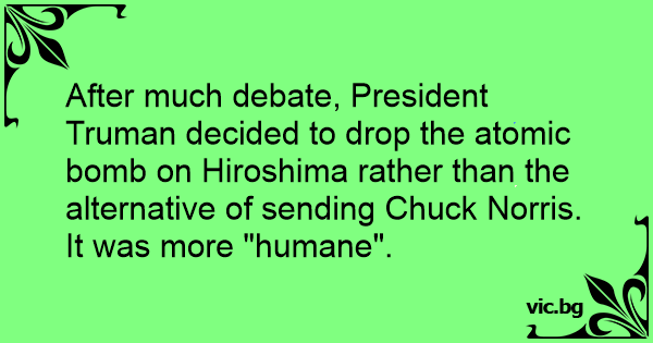 Why did President Truman drop the first atomic bomb? Because he thought it would be more humane than sending in Chuck Norris.