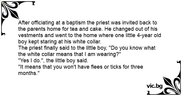 After officiating at a baptism the priest was invited back to the parents home for tea and cake. He changed out of his vestments and went to the home where one little 4-year old boy kept staring at his white collar.