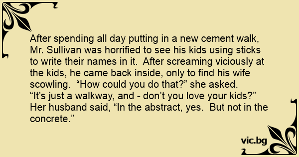 After spending all day putting in a new cement walk, Mr. Sullivan was horrified to see his kids using sticks to write their names in it. After screaming viciously at the kids, he came back inside, only to find his wife scowling. “How could you do that?” she asked.
