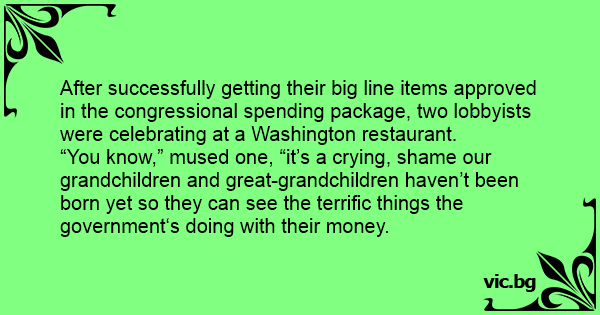 “You know,” mused one, “it’s a crying, shame our grandchildren and great-grandchildren haven’t been born yet so they can see the terrific things the government‘s doing with their money.