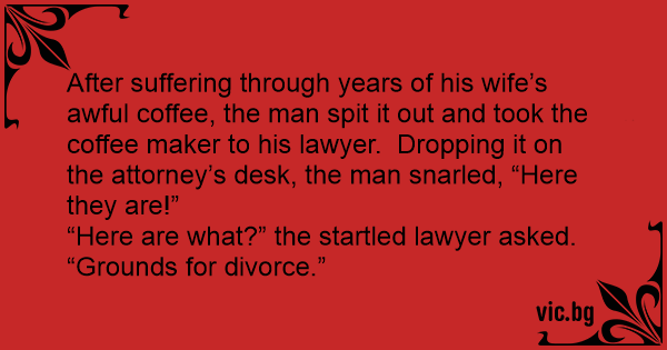 After suffering through years of his wife’s awful coffee, the man spit it out and took the coffee maker to his lawyer. Dropping it on the attorney’s desk, the man snarled, “Here they are!”