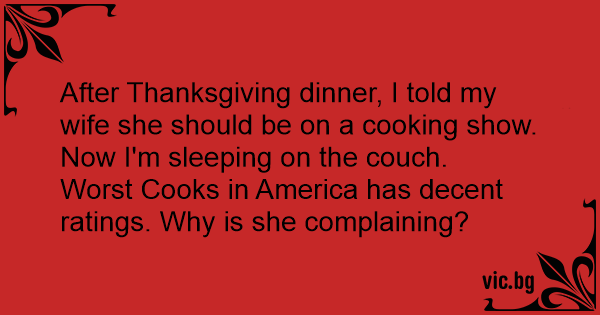 After Thanksgiving dinner, I told my wife she should be on a cooking show. Now I'm sleeping on the couch.