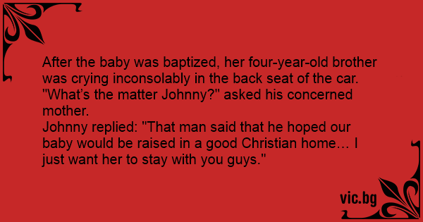 After the baby was baptized, her four-year-old brother was crying inconsolably in the back seat of the car.