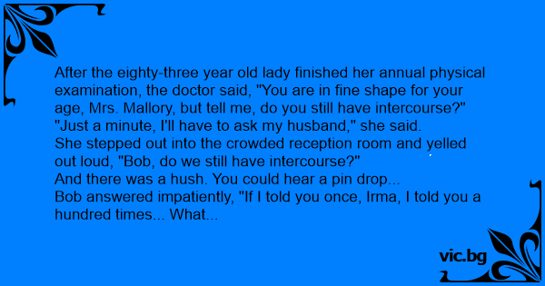 After the eighty-three year old lady finished her annual physical examination, the doctor said, "You are in fine shape for your age, Mrs. Mallory, but tell me, do you still have inтеrсоursе?"