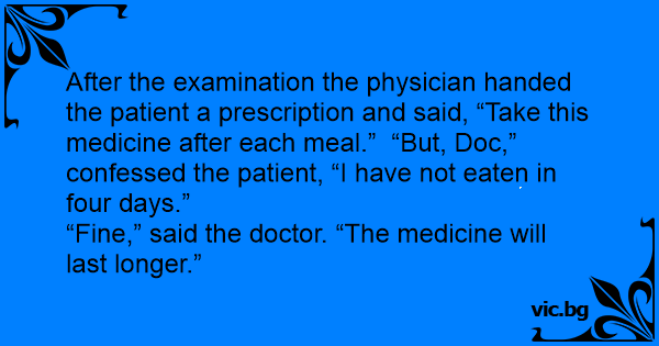 After the examination the physician handed the patient a prescription and said, “Take this medicine after each meal.” “But, Doc,” confessed the patient, “I have not eaten in four days.”