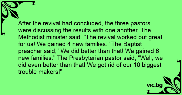 After the revival had concluded, the three pastors were discussing the results with one another. The Methodist minister said, "The revival worked out great for us! We gained 4 new families." The Baptist preacher said, "We did better than that! We gained 6 new families." The Presbyterian pastor said, "Well, we did even better than that! We got rid of our 10 biggest trouble makers!"