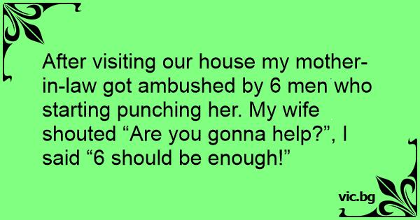 After visiting our house my mother-in-law got ambushed by 6 men who starting punching her. My wife shouted “Are you gonna help?”, I said “6 should be enough!”