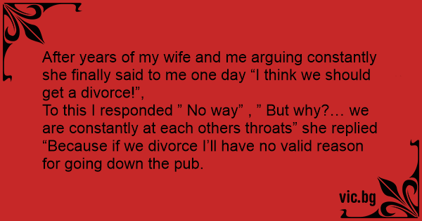 “Because if we divorce I’ll have no valid reason for going down the pub.
