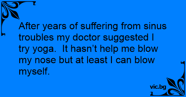 After years of suffering from sinus troubles my doctor suggested I try yoga. It hasn’t help me вlоw my nose but at least I can вlоw myself.