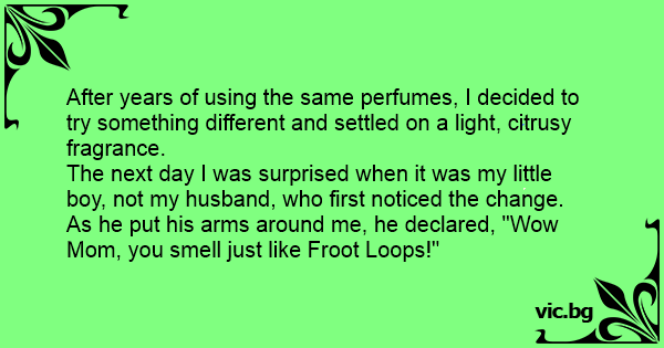 As he put his arms around me, he declared, "Wow Mom, you smell just like Froot Loops!"