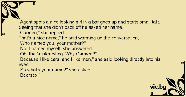 "Agent spots a nice looking girl in a bar goes up and starts small talk.