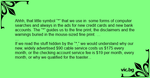 Ahhh, that little symbol “*” that we use in some forms of computer searches and always in the ads for new credit cards and new bank accounts. The “*” guides us to the fine print, the disclaimers and the warnings buried in the mouse-sized fine print. …