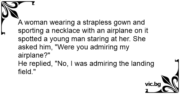A woman wearing a strapless gown and sporting a necklace with an airplane on it spotted a young man staring at her. She asked him, "Were you admiring my airplane?"