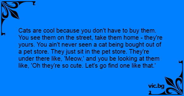 Cats are cool because you don't have to buy them. You see them on the street, take them home - they're yours. You ain't never seen a cat being bought out of a pet store. They just sit in the pet store. They're under there like, 'Meow,' and you be looking at them like, 'Oh they're so cute. Let's go find one like that.'