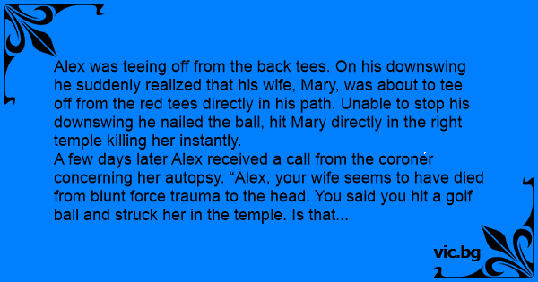 A few days later Alex received a call from the coroner concerning her autopsy. “Alex, your wife seems to have died from blunt force trauma to the head. You said you hit a golf ball and struck her in the temple. Is that correct?”