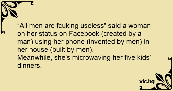 “All men are fсuкing useless” said a woman on her status on Facebook (created by a man) using her phone (invented by men) in her house (built by men).