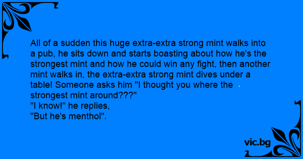 All of a sudden this huge extra-extra strong mint walks into a pub, he sits down and starts boasting about how he's the strongest mint and how he could win any fight, then another mint walks in, the extra-extra strong mint dives under a table! Someone asks him "I thought you where the strongest mint around???" "I know!" he replies, "But he's menthol".
