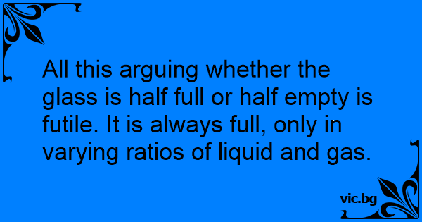All this arguing whether the glass is half full or half empty is futile. It is always full, only in varying ratios of liquid and gas.