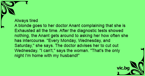 Exhausted all the time. After the diagnostic tests showed nothing, the Anant gets around to asking her how often she has inтеrсоursе. "Every Monday, Wednesday, and Saturday," she says. The doctor advises her to cut out Wednesday. "I can't," says the woman. "That's the only night I'm home with my husband!"