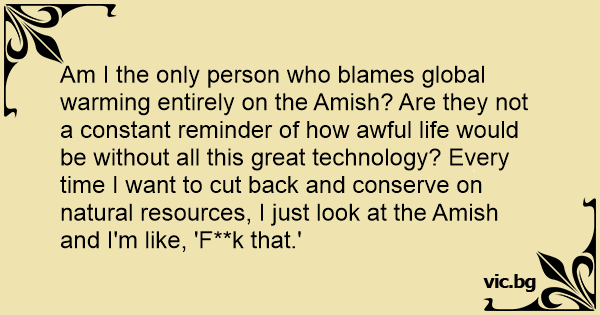Am I the only person who blames global warming entirely on the Amish? Are they not a constant reminder of how awful life would be without all this great technology? Every time I want to cut back and conserve on natural resources, I just look at the Amish and I'm like, 'F**k that.'