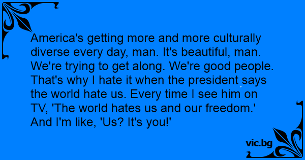 America's getting more and more culturally diverse every day, man. It's beautiful, man. We're trying to get along. We're good people. That's why I hate it when the president says the world hate us. Every time I see him on TV, 'The world hates us and our freedom.' And I'm like, 'Us? It's you!'