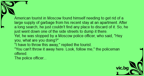 American tourist in Moscow found himself needing to get rid of a large supply of garbage from his recent stay at an apartment. After a long search, he just couldn't find any place to discard of it. So, he just went down one of the side streets to dump it there.