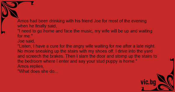 "Listen, I have a cure for the angry wife waiting for me after a late night. No more sneaking up the stairs with my shoes off. I drive into the yard and screech the brakes. Then I slam the door and stomp up the stairs to the bedroom where I enter and say your stud puppy is home."