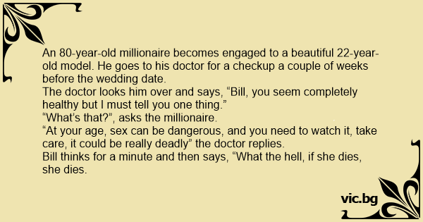 An 80-year-old millionaire becomes engaged to a beautiful 22-year-old model. He goes to his doctor for a checkup a couple of weeks before the wedding date.