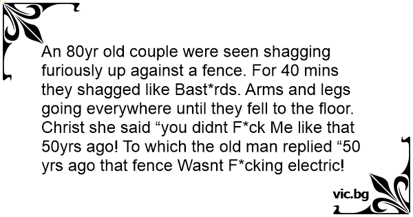 An 80yr old couple were seen shаgging furiously up against a fence. For 40 mins they shagged like Bast*rds. Arms and legs going everywhere until they fell to the floor. Сhrisт she said “you didnt fuск Me like that 50yrs ago! To which the old man replied “50 yrs ago that fence Wasnt F*cking electric!