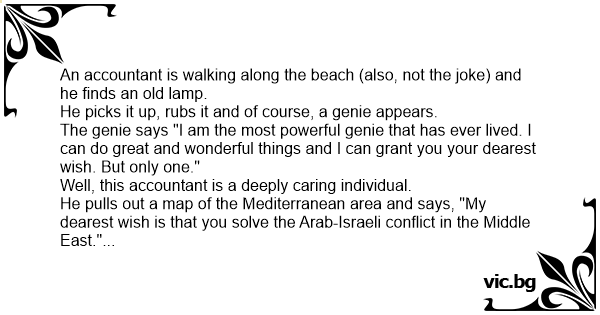 An accountant is walking along the beach (also, not the joke) and he finds an old lamp.